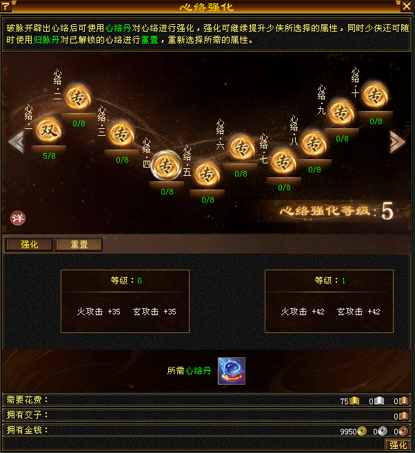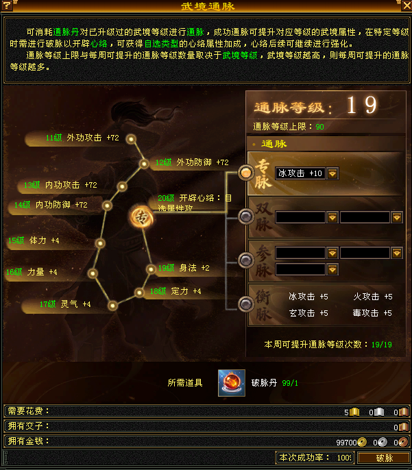 当少侠开启武境功能,并提升了武境等级后,即可使用武境通脉来对已升级的武境属性进行强化。